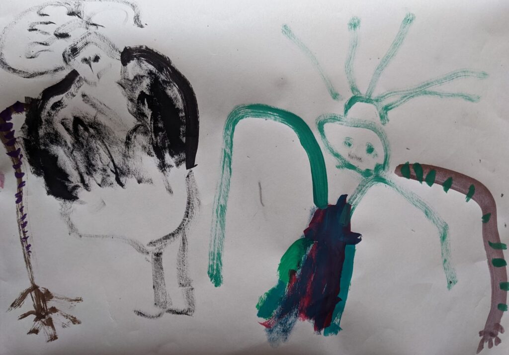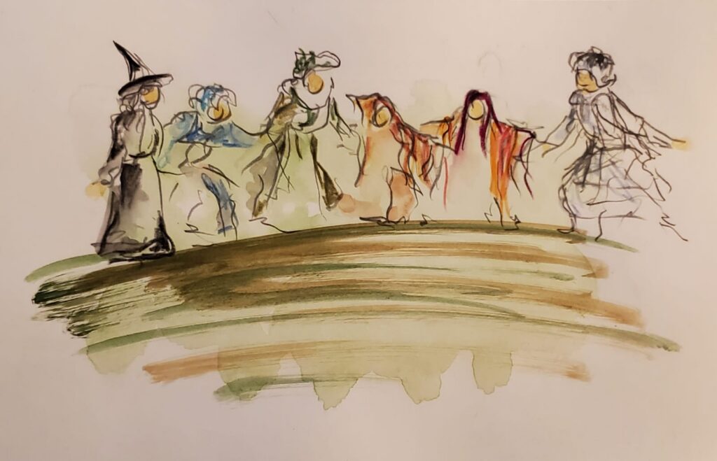 Dies war eine Übung bei einer der ersten Proben für das Kinderstück „Die kleine Hexe“. Die Schauspieler:innen testeten verschiedene Bewegungsmuster und Klänge aus. Das Ziel war, dass die unterschiedlichen Hexen – Feuerhexe, Flusshexe, Kräuterhexe, Sumpfhexe, Ungezieferhexe, Waldhexe, Wetterhexe, Windhexe und Oberhexe – am Ende jeweils ihr ganz eigenes Klang- und Bewegungsmuster haben. Das Endresultat war sehr überzeugend und konnte im Sommer auf der Bühne bewundert werden.
